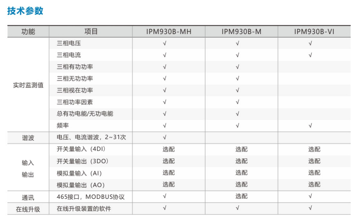 MPM930B系列是三相数字式多功能测控电表,广泛用于数据中心、工业、商业电力系统和变电站中。其中MPM930B-VI是电压电流表,MPM930B-M是包含三相全功能测量智能电表,MPM930B-MH是包含三相全功能以及2~31次谐波测量的智能电表,MPM930B系列电表以工业级微处理器为核心,处理速度高,稳定性强,具有很高的性价比,集电量遥测、遥信等功能于一体。