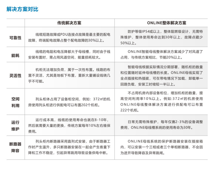 Online智能小母线用与数据中心机房末端供电,容量可由100-630A。0nline智能小母线防护等级为IP55,适用大多数应用场合的要求。Online智小母线通过可带电热插拔的插接箱对PDU进行供电,插接箱的供电容量从16A直至100A。